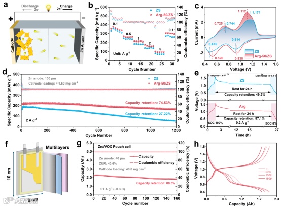 图7. (a)Zn//VOX全电池示意图;(b)全电池在ZS和Arg-50/ZS电解液中的倍率性能;(c)Zn//VOX全电池在ZS和Arg-50/ZS电解液中于0.1 mV s–1扫描速率下的循环伏安曲线;(d)Zn//VOX全电池在ZS和Arg-50/ZS电解液中于2 A g–1电流密度下的循环稳定性;(e)含/不含Arg的ZS电解液在充电至1.6 V、静置24小时并放电至0.4 V后的容量保持率;(f)Zn//VOX软包电池示意图;基于Arg-50/ZS电解液的Zn//VOX软包电池的(g)循环性能及(h)相应的充放电曲线。