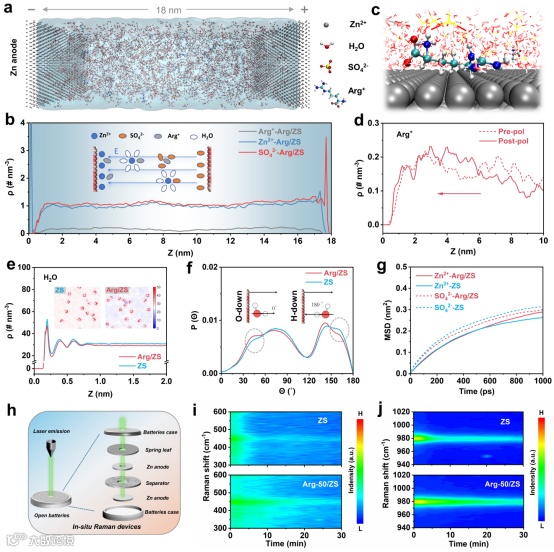 图3.(a)用于电极界面恒电势分子动力学模拟的模型;(b)Arg/ZS体系中Arg+、Zn2+和SO42−的数密度分布;(c)吸附在负极上的Arg+的分子动力学模拟快照;(d)施加电压前和施加电压后Arg+数密度的变化;(e)Arg/ZS体系与ZS体系中H2O数密度的比较;(f)水分子氧-氢键矢量与锌负极法向量之间的夹角;(g)两种电解液中锌离子和硫酸根离子的均方位移;(h)原位拉曼装置示意图;不同电解液中(i)Zn2+溶剂化结构和(j)SO42−振动的拉曼光谱。