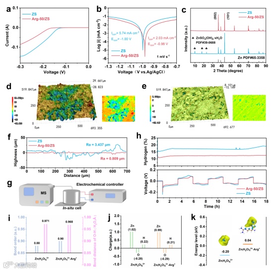 图4.(a)扫描速率为1 mV s–1的线性扫描伏安曲线;(b)不同电解液的Tafel曲线;(c)锌负极在不同电解液中循环100次后的XRD图谱;(d)ZS电解液、(e)Arg-50/ZS电解液中循环后锌箔的3DCLSM图像及(f)其对应的表面粗糙度曲线;(g)微分电化学质谱装置示意图及(h)不同电解液中的原位测试结果;(i)O-H(H2O)的键级和键长;(j)Zn(H2O)62+和Zn(H2O)52+-Arg+的原子电荷及(k)最低未占分子轨道能级。