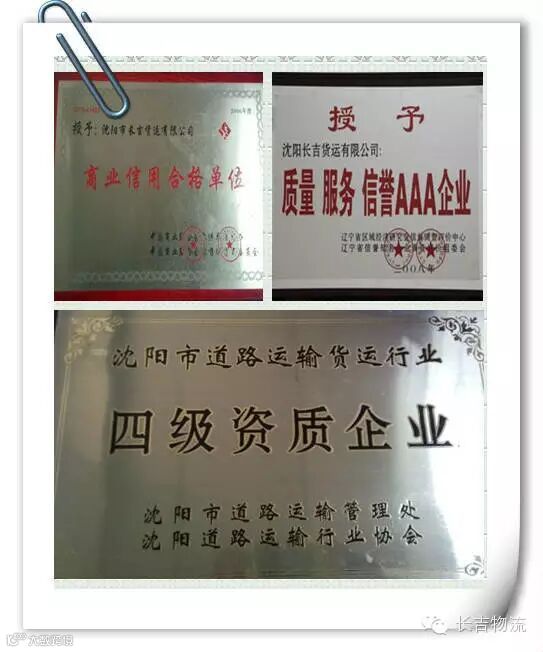 长吉物流在2002年被沈阳道路运输信誉知名企业调查评价组委会评为AAA知名单位,同时被交通局评为准三级运输企业。