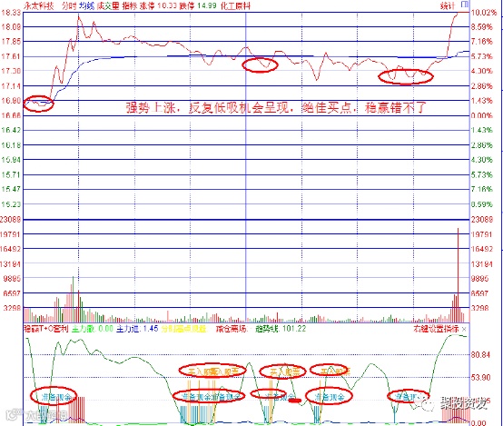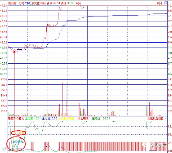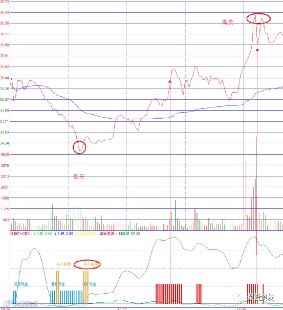 下面我先给大家介绍一下如何用该指标去捕捉各股的分时买点以及如何完美的逃顶。见下图: