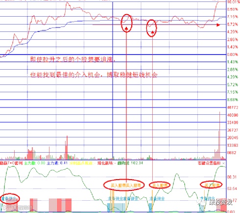1、高抛低吸操作法则:代表股价分时运行轨迹的趋势白线由高到低运行,一旦回落到零轴附近,代表股价进入相对底部区域,同时连续出现蓝色柱子,提示“准备资金”信号,要做好低吸准备,等待时机建仓;趋势线继续在0轴附近震荡,“主力进”提示数值增大,同时出现棕色长柱提示“买入股票”信号,大胆低吸即可;