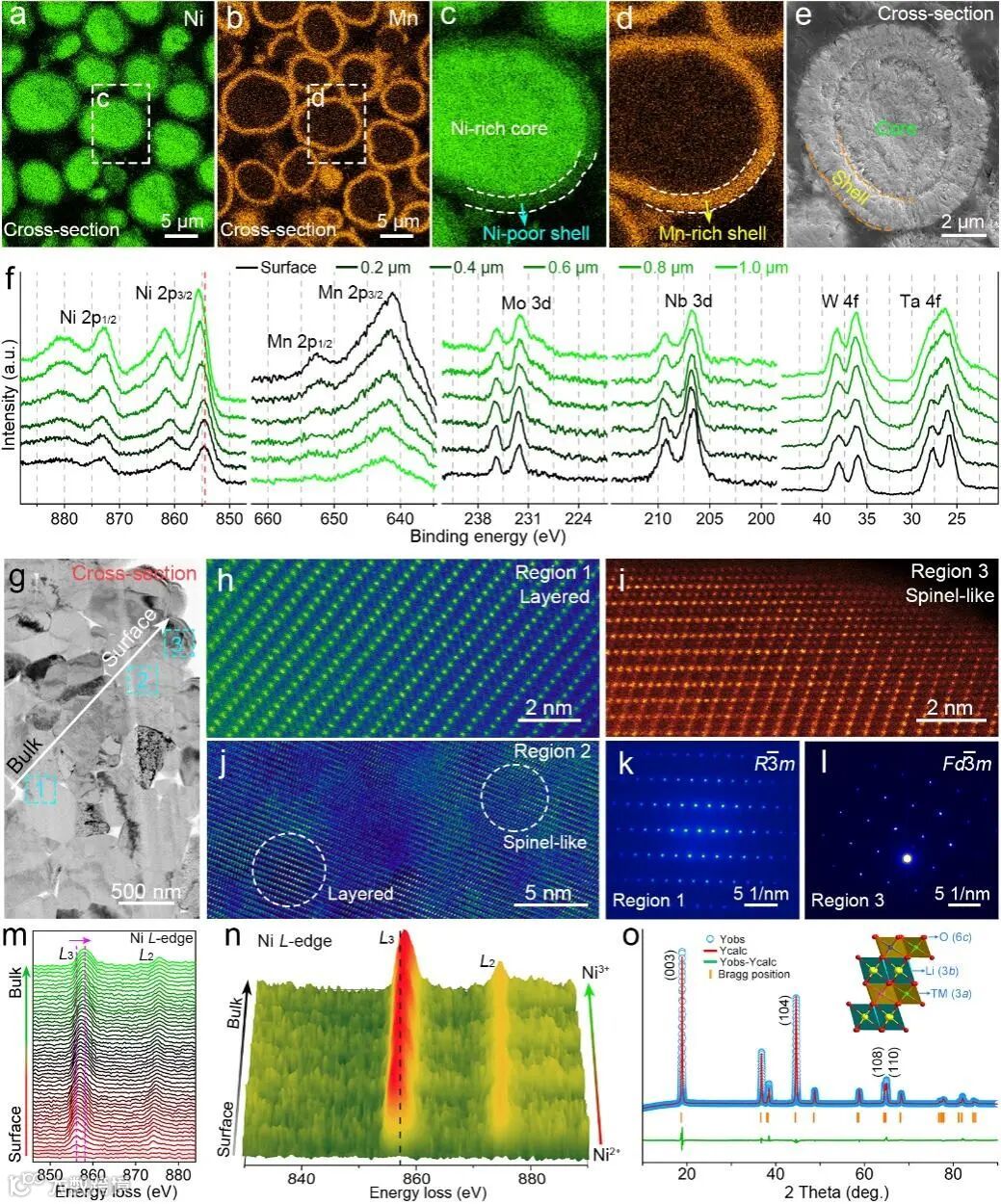 要点一:富镍核心@富锰壳层的组分分布构建主体层状@表面尖晶石的双相结构