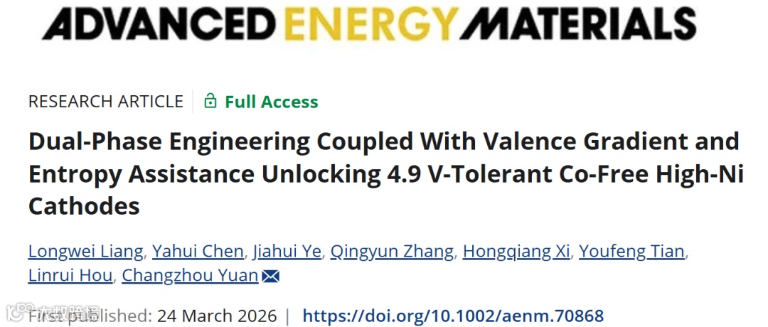 近日,来自济南大学的原长洲教授,在国际知名期刊Advanced Energy Materials上发表题为“Dual-phase engineering coupled with valence gradient and entropy assistance unlocking 4.9 V-tolerant Co-free High-Ni cathodes”的观点文章。该观点设计了一种高镍、无钴的正极材料,其具有熵辅助的核壳层状/尖晶石双相结构,并结合了镍价态梯度框架,通过多组分复合掺杂的共沉淀策略实现。由富镍核/富锰壳排列驱动的从表面尖晶石相到体相层状相的连续结构有序化,以及熵辅助和价态梯度布局,极大地防止了机械降解、表面副反应和氧损失,同时在容量和可持续性之间保持了最佳平衡,实现了4.9 V的稳定高压运行,极大地推动了高镍、无钴正极材料向可商业化水平迈进。