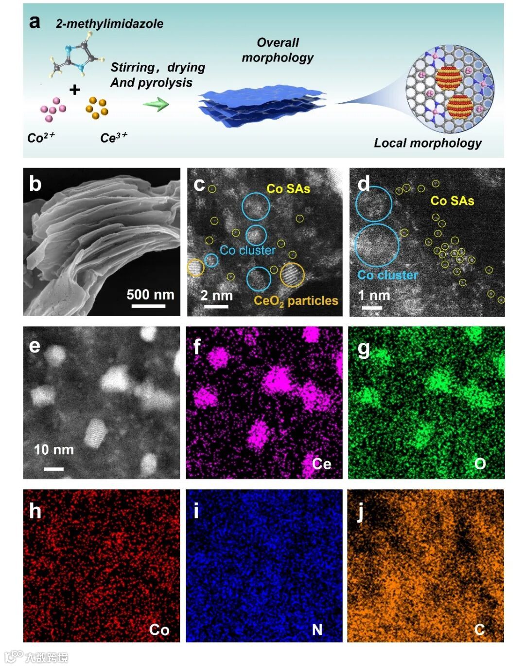 图 2. CeO₂/Co–N–C催化剂合成及结构表征。(a)制备流程。(b)形貌。(c–e)高角度环形暗场扫描透射电子显微镜(HAADF–STEM)结果。(黄色圆圈表示钴单原子,蓝色圆圈表示钴团簇,棕色圆圈表示 CeO₂ 颗粒)。(f–j)能谱元素分布图。
