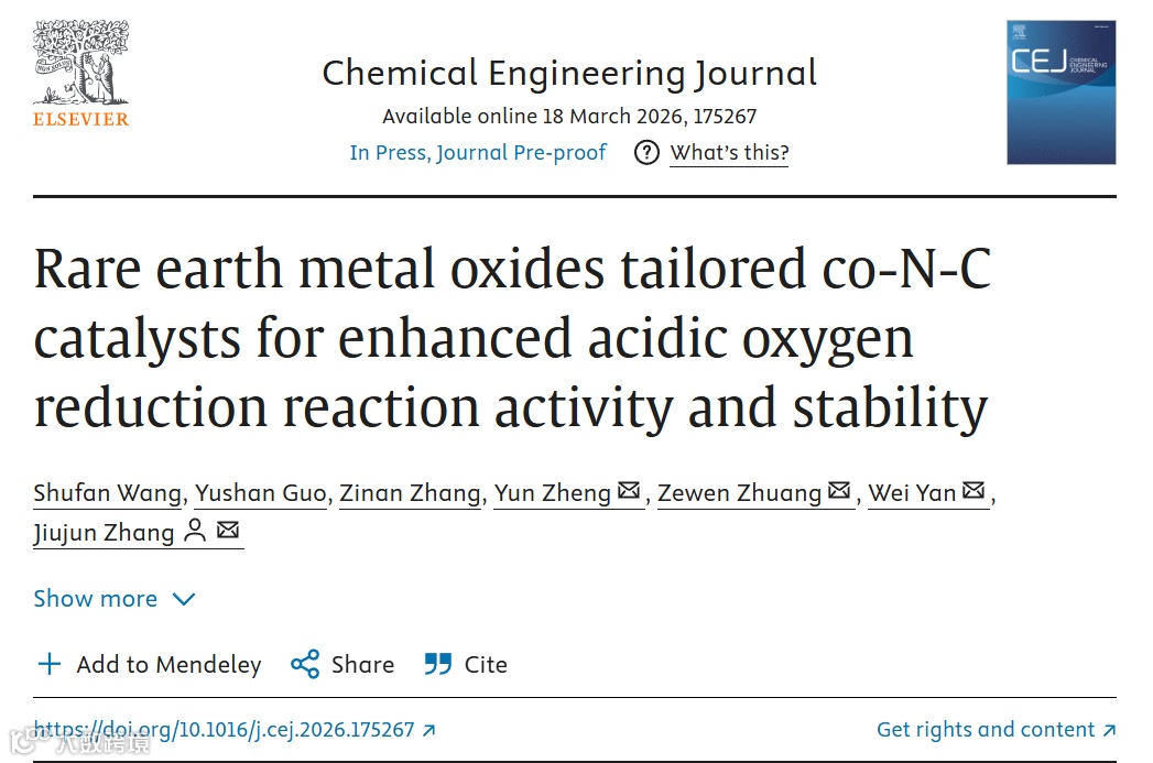 近日,福州大学郑云教授/张久俊院士团队在 Progress in Materials Science (https://doi.org/10.1016/j.pmatsci.2024.101389)、Applied Catalysis B : Environment and Energy (https://doi.org/10.1016/j.apcatb.2025.125493) 及 Chemical Engineering Journal (CEJ) 等期刊上连续发表多项研究成果。本文重点解读其发表于 Chemical Engineering Journal 的研究工作,题为“Rare earth metal oxides tailored Co–N–C catalysts for enhanced acidic oxygen reduction reaction activity and stability”。该工作不仅为突破M–N–C催化剂在活性和稳定性方面的局限提供了新路径,也为深入理解稀土金属氧化物(REMOs)在电催化ORR中的作用机制提供了新的见解。