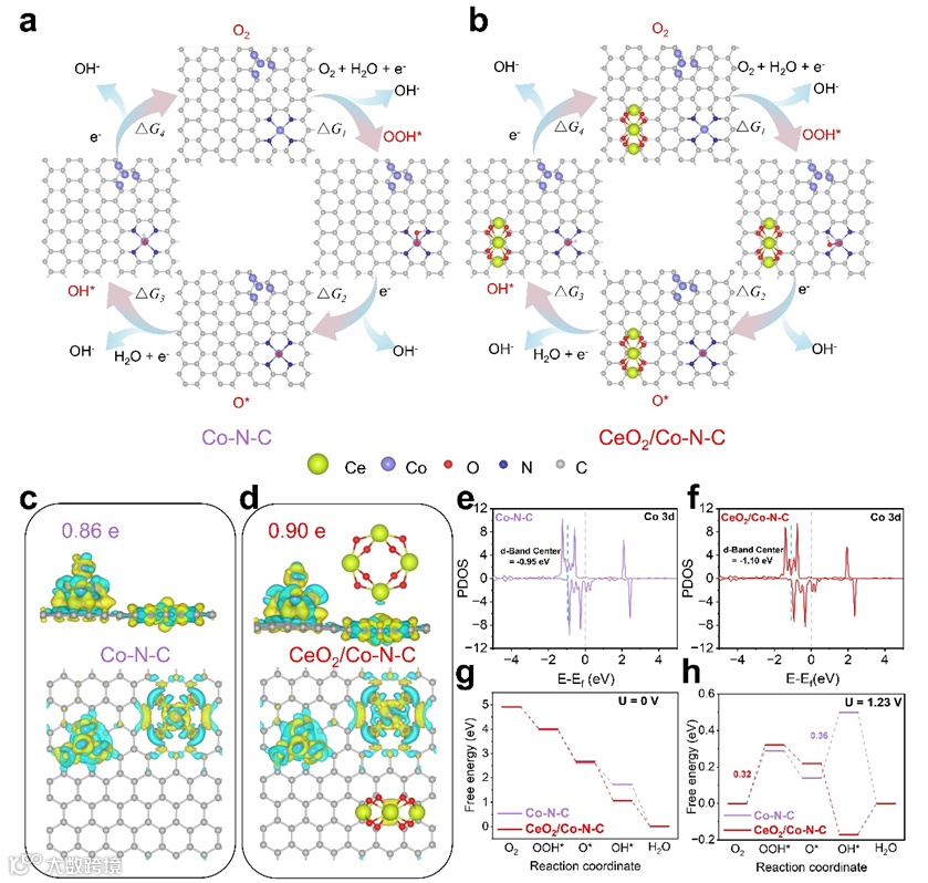 为揭示催化性能显著提升的内在机制,研究通过DFT计算系统分析了CeO₂修饰对Co–N–C催化剂电子结构及反应路径的影响。结果表明,引入CeO₂后,催化剂表面Co位点附近出现明显的电子富集,Bader电荷分析显示Co电荷由0.86 |e|增加至0.90 |e|,表明CeO₂向Co发生电子转移,形成强电子耦合作用。进一步的PDOS分析表明,CeO₂的引入使Co位点的d–band中心由−0.95 eV下移至−1.10 eV,从而削弱氧中间体的过强吸附,优化反应路径,符合d–band理论对催化活性的调控规律。在反应动力学方面,自由能计算显示,在1.23 V条件下,未修饰Co–N–C的速率决定步骤为O*向OH*转化(能垒0.36 eV),而引入CeO₂后转变为O₂向OOH*过程,且能垒降低至0.32 eV,表明反应路径得到优化、动力学显著加快。