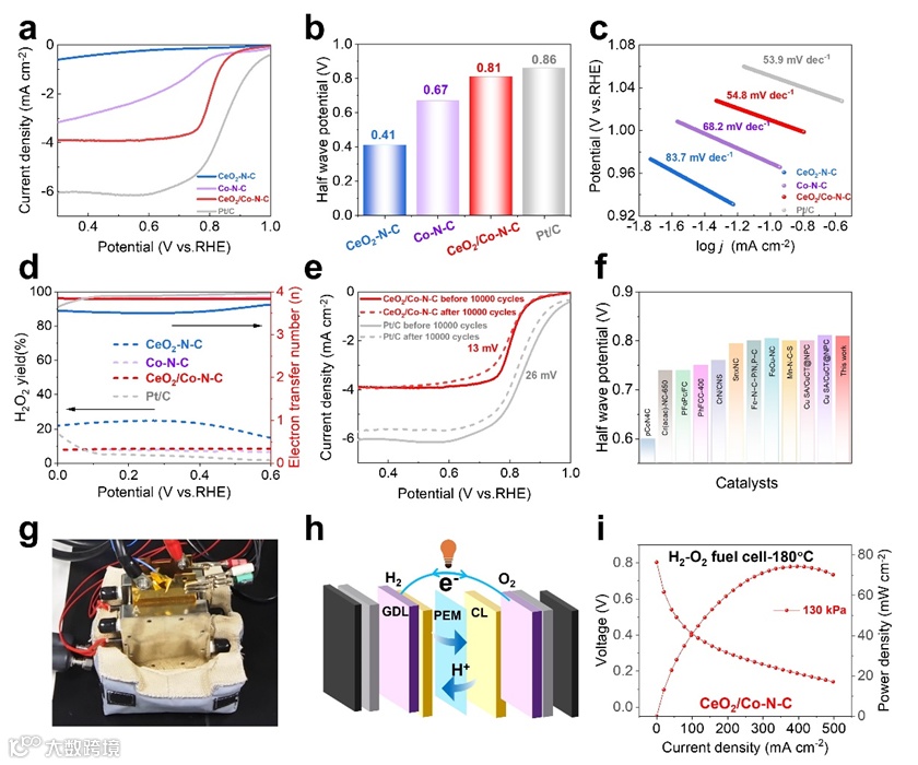图 5. 电化学 ORR 性能及高温质子交换膜燃料电池测试。(a)线性扫描伏安曲线(1600 转/分钟,氧气,0.5 M 硫酸溶液)。(b)催化剂的半波电位(E1/2)柱状图。(c)相应的Tafel曲线。(d)电子转移数(n)和 H2O2 产量(%)。(e)耐久性测试。(f)与先前报道的催化剂的性能对比分析。注释:所有提及的参考催化剂均在相同的实验参数(1600 转/分钟,氧气,0.5 M 硫酸溶液)下进行评估,这些参数与我们研究中详细描述的参数相同。(g)高温质子交换膜燃料电池测试装置的示意图。(h)典型的高温质子交换膜燃料电池的结构图。(i)在 180 °C 下、背压为 130 kPa 时测量的 I–V 极化曲线和功率密度曲线。