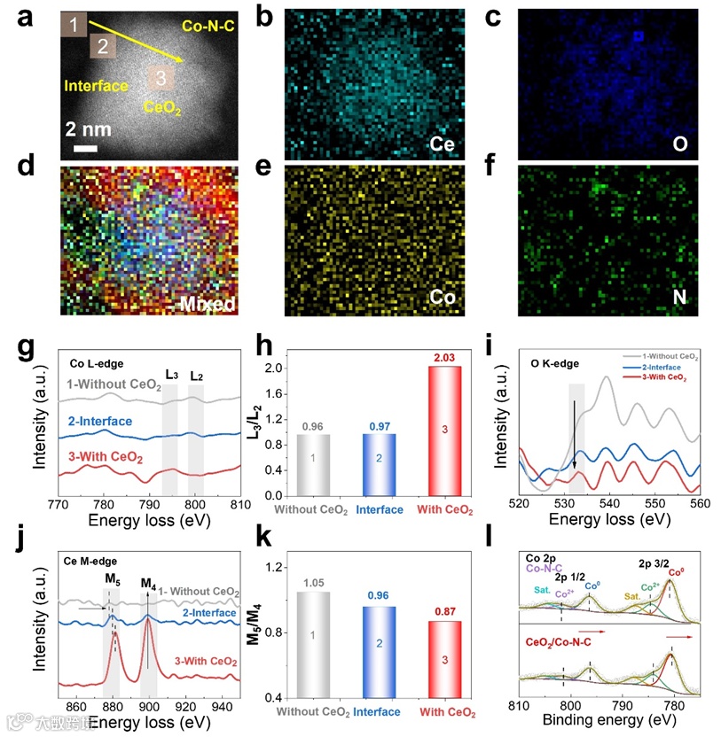 图 3. 电子结构和化学成分表征。(a)高角度环形暗场扫描透射电子显微镜(HAADF–STEM)图像;(b–f)能量色散 X 射线光谱(EELS)元素分布图。(g)从三个不同区域获取的钴 L 边 EELS 光谱:点 1(无 CeO₂)、点 2(界面)和点 3(有 CeO₂)。(h)从点 1 至点 3 计算得出的 L3/L2 强度比。(i)氧 K 边和(j)铈 M 边 EELS 光谱,采集自相同位置。(注:光谱已归一化至预边背景,以便直接比较。)(k)相应的 M5/M4 强度比。(l)钴 2p 区域的高分辨率 X 射线光电子能谱(XPS)。
