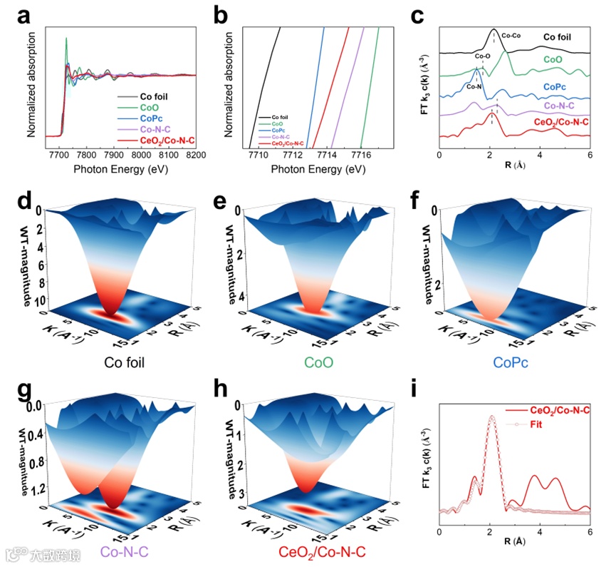 图 4. 电子构型和原子配位分析。(a、b)XANES 光谱(钴 K 边)。(c)标准样品(钴箔、CoO、CoPc)和实验样品(Co–N–C、CeO₂/Co–N–C)的 k3 加权傅里叶变换。(d–h)EXAFS 信号的小波变换图。(i)CeO₂/Co–N–C 的 EXAFS 拟合结果。
