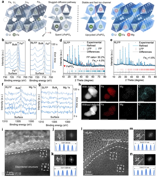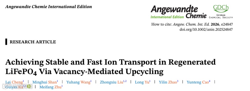 近日,东华大学朱美芳院士/徐桂银教授团队提出一种空位介导的优化再生策略,用于增强再生磷酸铁锂的结构稳定性和离子传输能力。该方法利用废旧磷酸铁锂(SLFP)中的锂空位缺陷促进掺杂剂扩散,同时补充锂元素与晶格结构调控。通过晶格调制实现废旧LiFePO4的优化再生:再生LiFePO4(RLFP)相较商用材料具有缩短的Fe-O键与伸长的Li-O键,形成支持更快速稳定锂离子传输的通道。该工作以“Achieving Stable and Fast Ion Transport in Regenerated LiFePO4 via Vacancy-Mediated Upcycling”为题发在Angewandte Chemie International Edition期刊上。