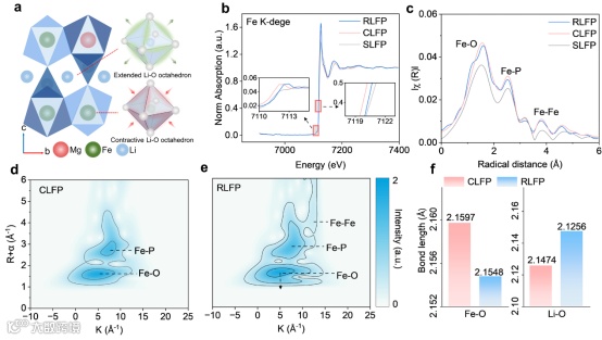 XAFS(图2b)分析显示,RLFP的预边峰强度与CLFP相当且显著高于SLFP,证实Fe3+还原为Fe2+,其峰位偏移表明Fe电子云密度降低。EXAFS(图2c)及小波变换(图2d,e)证实RLFP的Fe-O键缩短、局部结构发生畸变。XRD精修结果显示(图2f),RLFP的Fe-O键较CLFP收缩,Li-O键扩张,(311)衍射峰偏移证实Li+传输通道拓宽。HRTEM-GPA分析表明,RLFP在ac平面存在拉伸应变,利于Li+扩散,而SLFP呈压缩应变。综上,空位介导的Fe位Mg掺杂通过调控晶格键长和应变,实现了RLFP晶格层面的结构增强。