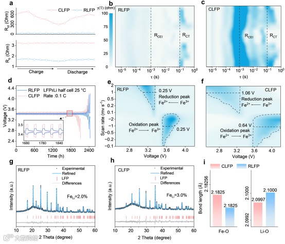 为阐明再生材料的长期稳定性,分析RLFP和CLFP经过1000次循环后的动力学及结构缺陷。原位EIS和DRT测试表明(图4b,c),循环后的RLFP保持远低于CLFP的电荷转移阻抗和固有阻抗,且稳定性更优。GITT和CV测试(图4d-f)证实其持续保持低极化特性,且氧化还原峰对称。XRD精修结果显示(图4g-i),循环后的RLFP反位缺陷更少,并保留了有利的Fe-O和Li-O键长。微观表征进一步表明,RLFP的表面形貌和(112)晶面晶格间距保持完整,而CLFP出现颗粒开裂和晶格缺陷。以上结果证实,空位介导优化再生可在长期循环中维持材料的动力学稳定性和结构完整性。