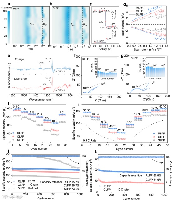 原位EIS和DRT分析(图3a,b)显示,RLFP的电荷转移阻抗和固有阻抗均低于CLFP和SLFP,界面及电荷转移阻力减小。CV测试(图3d)表明其氧化还原极化电压最低。原位红外光谱(图3e)显示RLFP的Li+溶剂化/去溶剂化动力学更快,长期循环阻抗稳定。性能测试中,RLFP的倍率性能、高低温性能及循环稳定性均优于二者,1 C循环1000次容量保持率达95.7%,10 C循环表现突出,证实空位介导再生可显著提升离子传输动力学及电池综合性能,且具有普适性。