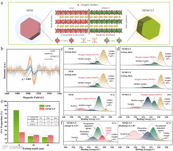 Fig. 2. (a) Schematic diagram of oxygen vacancies on NFN and NFMCLT surfaces. (b) Comparison diagram of EPR tests for oxygen vacancies in NFN and NFMCLT. XPS test diagrams of O 1s for NFM and NFMCLT under different etching depths (c, d), as well as the comparison diagram of the content ratio of oxygen vacancies (e). (f) XPS comparison diagram of O 1s in the charging and discharging states of NFMCLT.