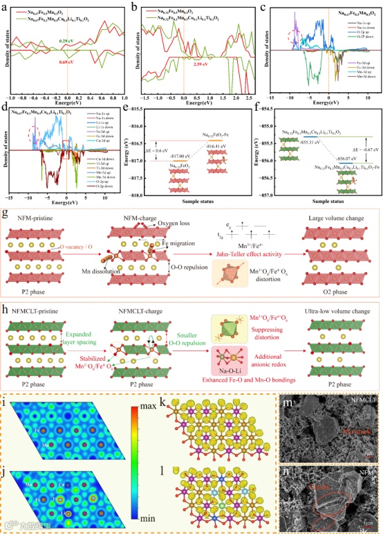 Fig. 6. Enlarged views of the TDOS results for NFM and NFMCLT materials at different sodium contents: (a) Na0.67; (b) Na0.32. pDOS diagrams of NFM and NFMCLT in their initial state (c, d). Schematic diagram of local Fe migration energy during sodium removal process of P2-Na0.32FeO2 (e) and NFMCLT-Na0.32 (f). Schematic representation of the structural evolution of NFM and NFMCLT during desodiation process (g, h). Contour maps of the electron localization function (ELF) for TM in the [001] direction: (i) NFM; (j) NFMCLT. 3D electron density distribution maps: (k) NFM; (l) NFMCLT. SEM images of NFMCLT after 100 cycles at 200 mA g−1 current density (m). SEM images of NFM after 100 cycles at 200 mA g−1 current density (n).