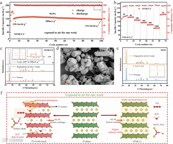 Fig. 5. NFMCLT exposed to air for one week: (a) cyclic test plot at 200 mA g−1 current density, (b) multiplicity plot at different current densities. Comparison of XRD patterns for NFMCLT after 100 cycles at a current density of 200 mA g−1 and after exposure to air for one week (c). SEM image of NFMCLT after exposure to air for one week (d). Comparison of XRD patterns for NFM after exposure to air for one week (e). Schematic representation of the structural changes of NFMCLT and conventional P2-Fe/Mn-based materials after one week of exposure to air (f).