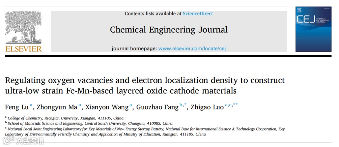 近日,来自中南大学的方国赵教授与湘潭大学的罗志高副教授合作,在知名期刊Chemical Engineering Journal上发表题为“Regulating oxygen vacancies and electron localization density to construct ultra-low strain Fe-Mn-based layered oxide cathode materials”的研究论文。该论文分析了典型钠离子电池层状Fe-Mn基正极材料Na0.67Fe0.5Mn0.5O2的失效原因,提出了一种调控氧空位分布状态和过渡金属与氧配体周围电子局域密度的双重改性策略来提升正极材料的电化学性能。