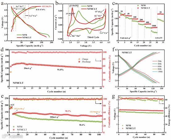 Fig. 3. Comparison of the first cycle GCD curves (a), third cycle CV curves (b), and rate performance at different current densities (c) for NFM and NFMCLT. Cycling performance of NFMCLT at 20 mA g−1 (d). Comparison of cycling performance between NFM and NFMCLT at 200 mA g−1 (e). (f) The GCD curves of NFMCLT at different numbers of cycles under a current density of 200 mA g−1. (g) The median discharge voltage curve of NFMCLT during long-term cycling at a current density of 200 mA g−1. All tests were conducted within a voltage window of 1.8−4.3 V vs. Na+/Na.