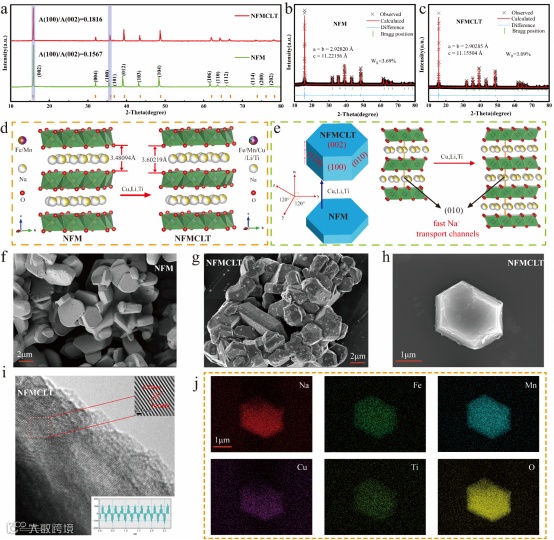 Fig. 1. (a) Comparative XRD patterns of NFM and NFMCLT. XRD refinement result maps of NFM (b), NFMCLT (c) and their corresponding structural schematics (d). Schematic diagrams of crystal growth of NFM and NFMCLT in quadratic coordinates before and after the introduction of Cu, Li, Ti (e). (f) SEM image of NFM. (g, h) SEM images of NFMCLT. (i) TEM images and lattice spacing analysis after FFT processing for NFMCLT. (j) EDS elemental mapping of NFMCLT.