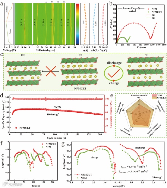 Fig. 4. (a) In-situ XRD patterns of NFMCLT during the first cycle. (b) EIS test results diagrams of NFM and NFMCLT. (c) Schematic diagram of the structural evolution of NFMCLT during cycling. (d) Cyclic test plot of NFMCLT at 1000 mA g−1 current density. (e) Radar chart comparing NFM and NFMCLT performance. (f) GITT test results for NFM and NFMCLT. (g) Voltage-LogD comparison plot of GITT test for NFM and NFMCLT.