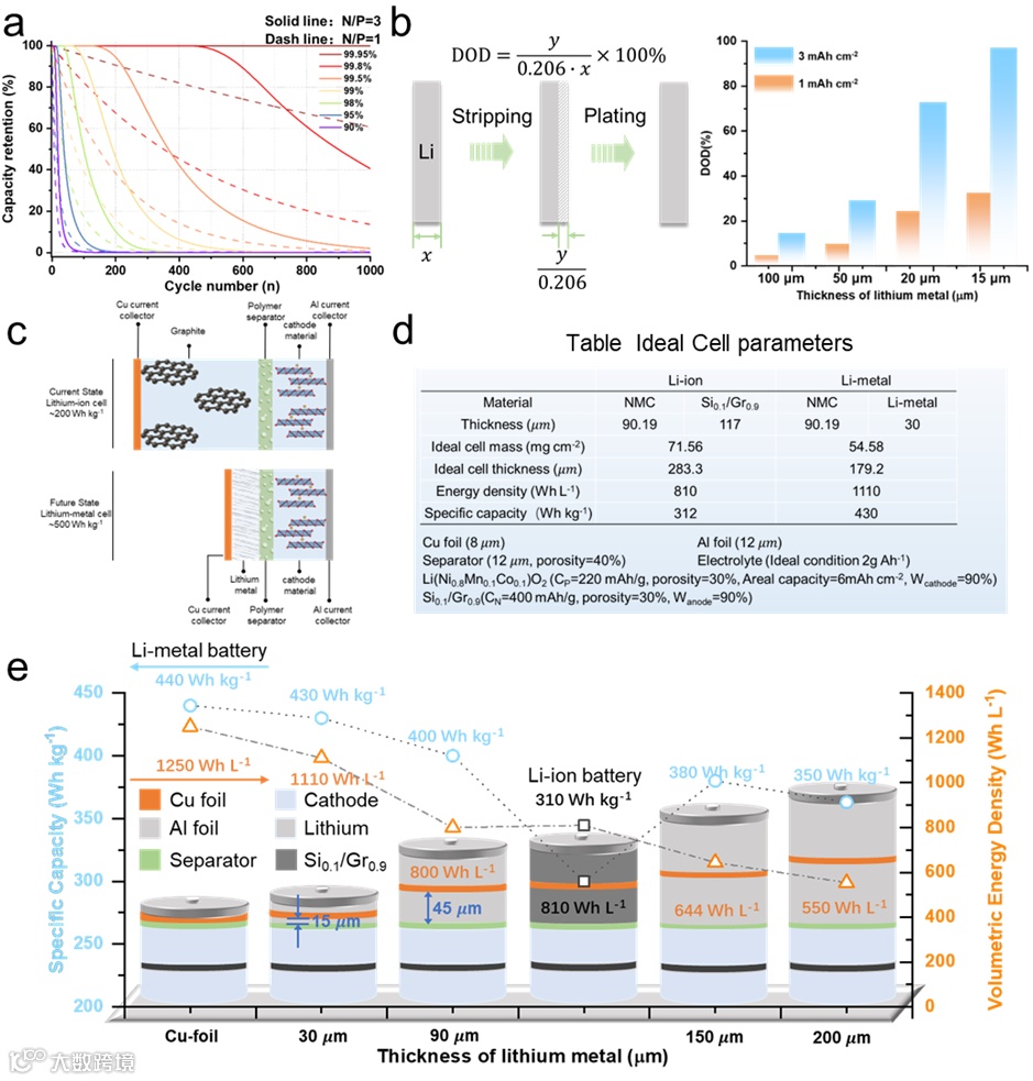 为了实现系统级500 Wh kg⁻¹的能量密度目标,必须采用锂金属负极。然而,简单地使用过量锂(厚锂箔)来补偿循环中的活性锂损耗,会严重降低电池能量密度并加剧副反应。计算表明,对于典型的面容量为3 mAh cm⁻²的正极,理论上仅需约15 μm厚的锂即可匹配(N/P ≈ 1.03)。使用50 μm的商用厚锂箔意味着引入了三倍以上的非活性锂,显著降低了负极能量密度。因此,将锂金属负极厚度减薄至20 μm以下,并维持高循环稳定性,是提升全电池能量密度的必由之路。