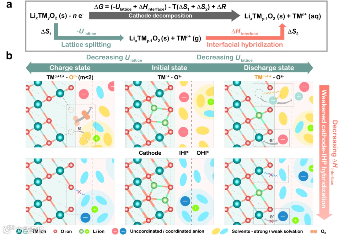 图1 LixTMyO2正极表面的界面退化能量机制及弱杂化内亥姆霍兹层作用机制示意图