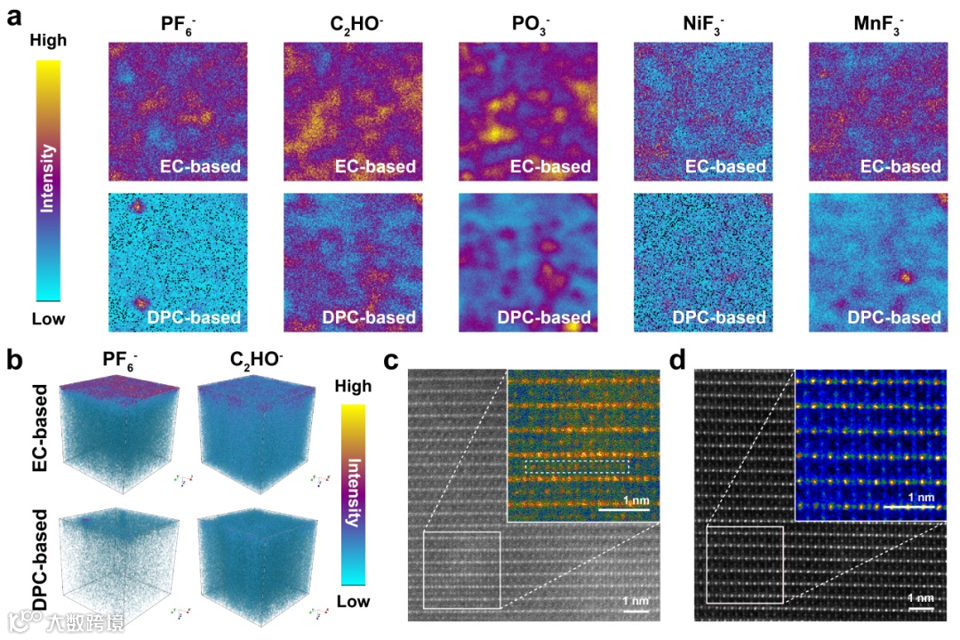 通过飞行时间二次离子质谱技术,能够更加直接地观察到传统电解液中LNMO正极与阴离子/溶剂分子间的强相互作用以及过渡金属的溶解现象(图4)。同时,在传统电解液中运行的LNMO正极虽循环性能较差,但其表面仍能够观察到致密的有机-无机复合CEI,结合过渡金属氟化物物种的大量出现可以说明,在高容量正极的深度循环稳定性影响因素中,正极-电解液的界面杂化作用相较界面CEI将起到更加至关重要的作用。此外,循环过后的LNMO正极的高角环形暗场像(HADDF-STEM)显示,界面杂化的调控不仅实现了对正极-电解液界面的稳定,同时也显著抑制了阳离子混排现象,保证了高容量运行过程中正极晶体结构的完整性。