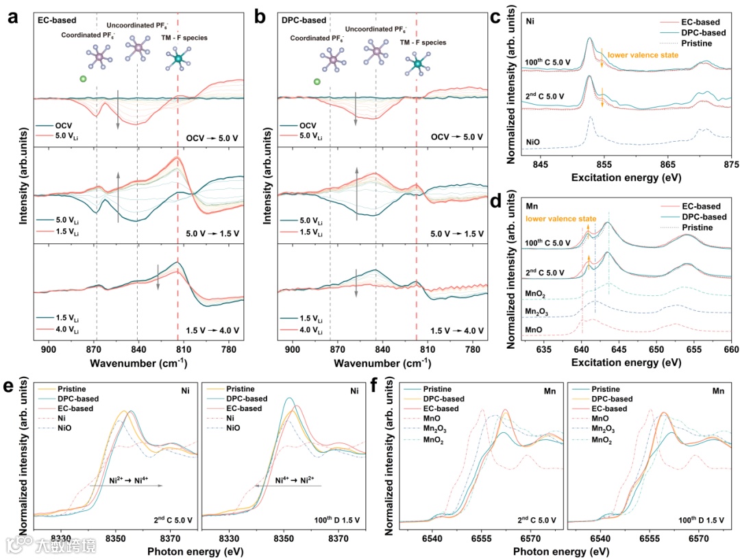 原位ATR-FTIR光谱与非原位同步辐射X射线吸收谱共同揭示了正极-电解液界面杂化的作用机制,正极与电解液间界面杂化行为促进了高容量正极在深度脱/嵌锂态与阴离子/溶剂分子发生不可逆电子转移行为。正极与阴离子及溶剂分子间的电荷转移行为不仅会导致正极中的过渡金属析出,不可逆地生成电化学惰性的过渡金属氟化物,造成晶体结构退化与容量损失,也使得电解液中的阴离子及溶剂分子被大量消耗(图3)。