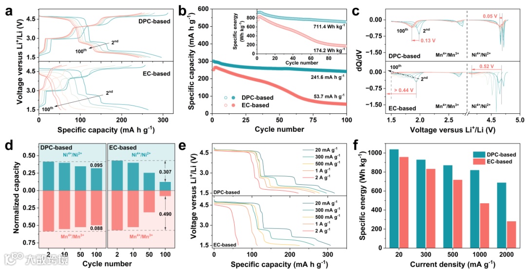 图2 LNMO正极搭配DPC基电解液及传统电解液的电池电化学性能表征