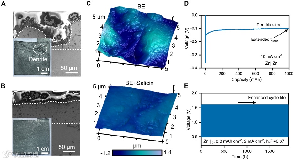 形态学表征证明了上述协同机制的有效性。在40 mAh cm-2超高面容量下沉积后(10 mA cm-2),使用水杨苷电解液的锌阳极表现出高度均匀的沉积形貌(平均高度75.4 μm,标准偏差仅3.7 μm),而基础电解液则产生大量枝晶(标准偏差达34.0 μm)。原子力显微镜进一步显示,改性锌阳极表面极其光滑(平均粗糙度Ra=67 nm),远优于对照组(Ra=298 nm)。原位光学显微镜监测也证实,水杨苷调控下的锌沉积为均匀的厚度生长,有效抑制了枝晶的快速生长。