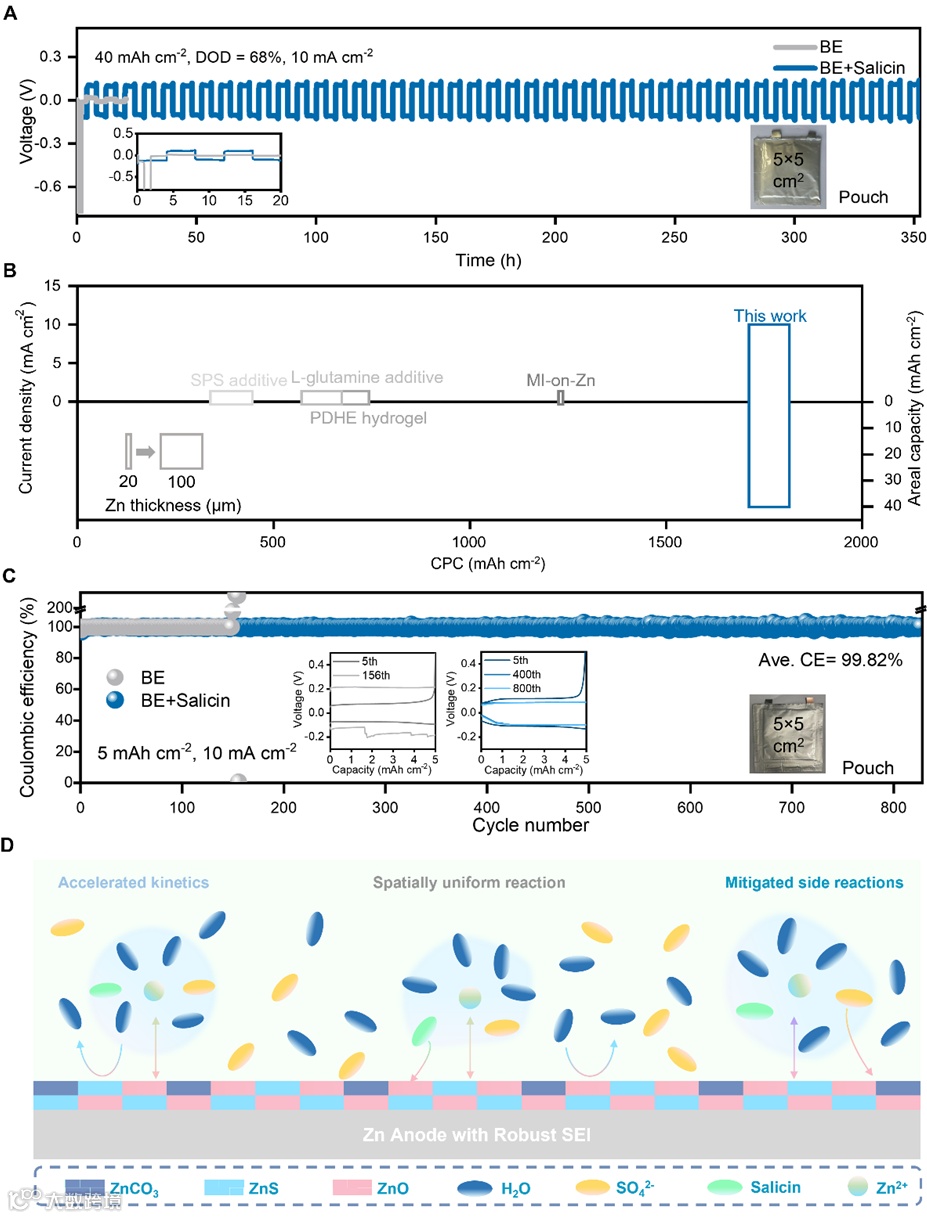 图4. 使用BE和BE+水杨酸对锌负极软包电池的稳定性评估