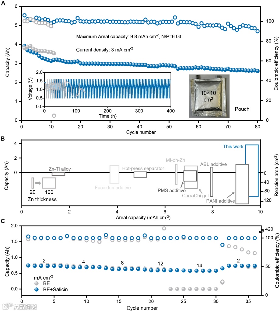 研究最终在全电池层面展示了其实际应用价值。100 cm2的双层Zn||I2软包全电池在3 mA cm-2下稳定循环近400小时,初始面容量高达9.8 mAh cm-2(总容量3.9 Ah),80次循环后容量保持率达66%。该全电池的面积容量和反应面积均超越了多数已报道的软包全电池。倍率性能测试也表明,即使在高达14 mA cm-2的电流密度下,电池仍能稳定工作,且库仑效率始终接近100%,证明了其快速的反应动力学和优异的循环稳定性。