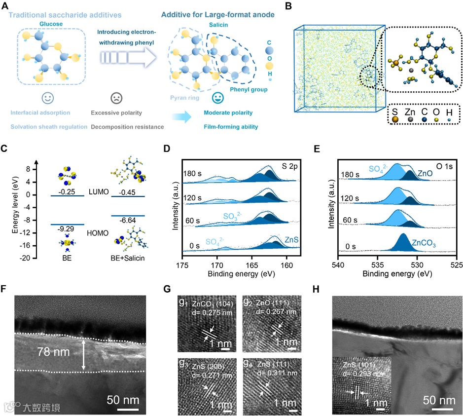 研究提出采用弱极性天然糖苷水杨苷作为电解液添加剂。理论计算与光谱分析(Raman、FTIR)表明,其苯环的吸电子效应减弱了分子极性,诱导形成了富含SO42-的弱溶剂化结构(Zn(H2O)(Salicin(SO4)),显著降低了Zn2+的脱溶剂化能垒(从37.99降至20.62 kJ mol-1),加速了界面动力学。同时,该弱溶剂化结构及其分子本身优先在界面还原分解,与原位诱导的阴离子分解协同,构建了一个富含ZnCO3/ZnO/ZnS、厚度约78纳米的混合固体电解质界面。该SEI兼具良好的亲锌性、离子导电性和机械强度,能适应剧烈界面形变。