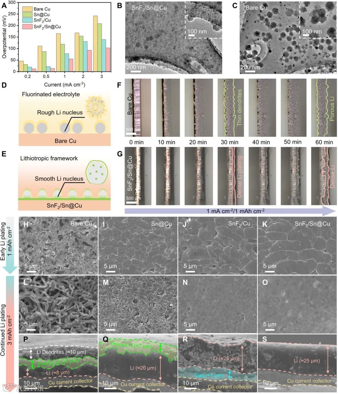 该研究突破传统单一界面优化的局限,创新性地提出了时空耦合的亲锂框架设计。该设计同步构建了静态的外延型亲锂Li-合金 (Li-Sn)集流体界面,以及动态分散于负极体相中的亲锂Li-M (M=Sn, Mg, Zn)/LiX (X=F, S, I)嵌入型晶种与SEI。这种多维度的亲锂结构框架在空间上降低了锂的临界成核能并提高了界面形核率,优化了锂在基底上的吸附与平面迁移,实现了均匀致密的初始成核,建立了均匀的初始电场;在时间维度上,动态分布的亲锂相持续优化了体相和SEI中的锂扩散行为,避免了局部电流集中并持续均匀化界面离子通量。通过这种时空耦合控制成功实现了全周期、高容量下的致密锂沉积趋向,在实际器件中解决了锂枝晶生长和负极结构疏松的问题,显著提升了超薄锂负极的可逆性。