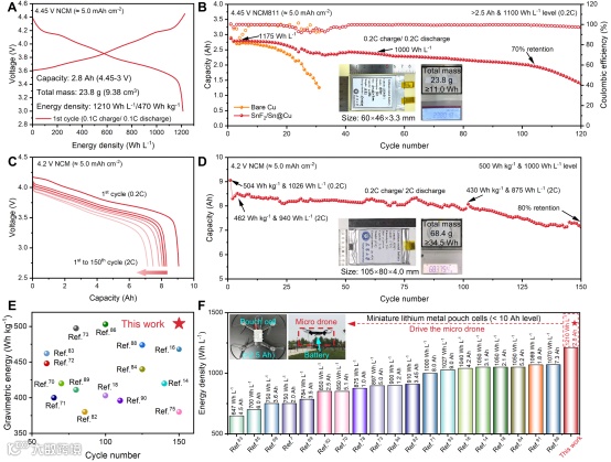 该研究基于时空耦合亲锂框架,成功推动了高比能锂金属电池的实用化进程。采用超薄负极与高载量NCM正极开发的2.8 Ah微型高能锂金属电池,在0.1C下实现了1210 Wh L-1的体积能量密度,0.2C稳定循环超100次,其性能满足微型四旋翼无人机重复起降、空中悬停、快速机动等高功率需求,兼具高能量密度与高功率输出特性。进一步开发出的大容量9.0 Ah软包电池,同时实现了504 Wh kg-1和1026 Wh L-1的能量密度,在2C高倍率放电下循环超150次,容量保持率达80%以上。该研究代表了高比能、长寿命、高功率锂金属电池技术的实用化突破,为无人机、全电飞行器等新兴领域提供了关键的能源技术支撑。