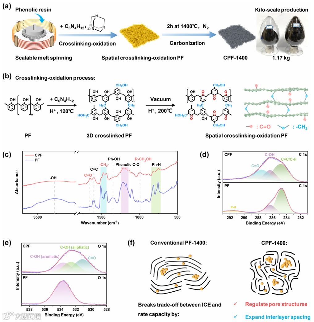 传统的单维度优化策略不可避免地会导致HC负极的ICE与倍率性能之间的取舍。研究团队采用六亚甲基四胺(HMTA)作为交联剂,通过巧妙的两步反应,在HC前驱体中构建了稳定的三维网络结构。这一过程中,酚醛树脂中的羟基被部分氧化为羰基(C=O),同时形成了丰富的亚甲基桥(-CH2-),为后续碳化过程奠定了良好的结构基础。值得一提的是,该合成方法具备良好的可扩展性,单批次产量可达公斤级,为未来的工业化生产奠定了基础。