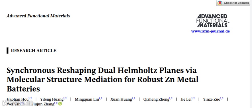 近日,福州大学张久俊院士团队在国际知名期刊 Advanced Functional Materials 上发表题为 “Synchronous Reshaping Dual Helmholtz Planes via Molecular Structure Mediation for Robust Zn Metal Batteries” 的研究论文。该工作以谷氨酰胺衍生物为模型体系,提出一种分子构型调控策略,实现了内亥姆霍兹平面(IHP)和外亥姆霍兹平面(OHP)的协同工程化调控。研究揭示了添加剂分子构型与双亥姆霍兹平面结构的构效关系,发现甘氨酰 - L - 谷氨酰胺(Gly-L-Glu)因垂直吸附构型成为最优添加剂,其可同步重构 IHP 和 OHP,有效抑制副反应并加速脱溶动力学,大幅提升锌金属电池的循环稳定性。
