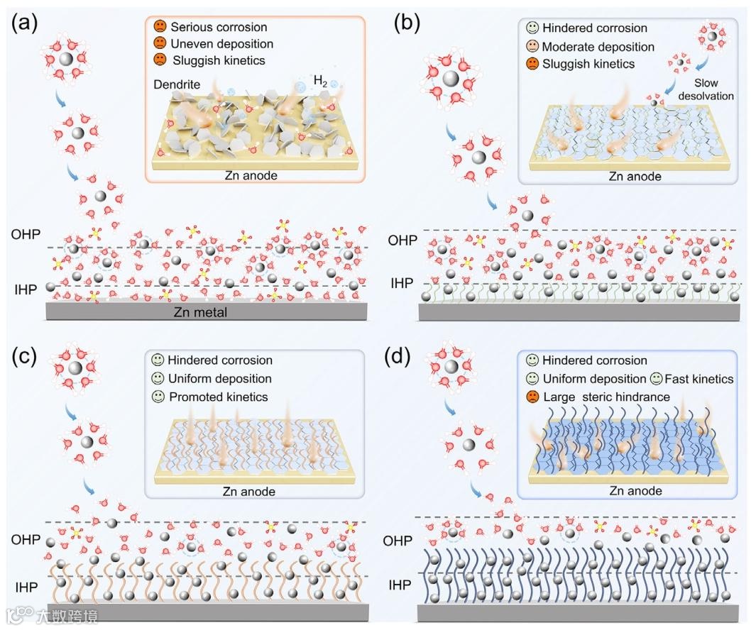 图 1 | 外亥姆霍兹平面(OHP)与内亥姆霍兹平面(IHP)调控及相应锌沉积行为的示意图(a) 原始电解液 (b) 仅能调控 IHP 的电解液添加剂 (c) 可协同调控 IHP/OHP 的电解液添加剂 (d) 可调控 IHP/OHP 但空间位阻过大的电解液添加剂