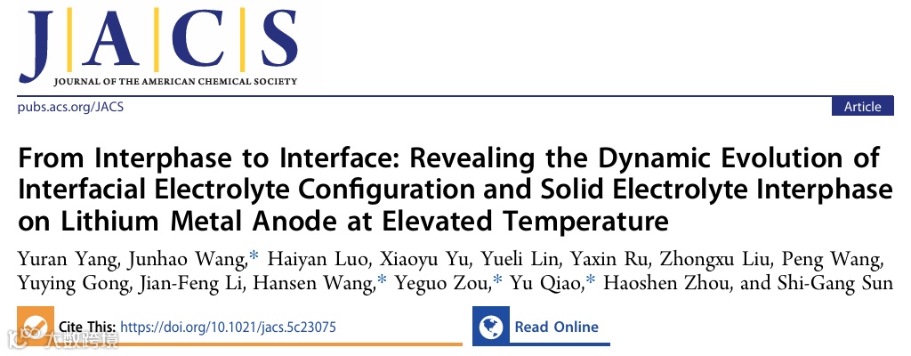 近日,来自厦门大学孙世刚院士团队乔羽教授、邹业国副教授、宁德时代王瀚森博士等研究者合作,在国际知名期刊Journal of the American Chemical Society上发表题为“From Interphase to Interface: Revealing the Dynamic Evolution of Interfacial Electrolyte Configuration and Solid Electrolyte Interphase on Lithium Metal Anode at Elevated Temperature”的观点文章。该观点文章通过先进谱学方法揭示了高温下界面电解液构型与固体电解质界相(SEI)的动态演化规律。研究发现:在锂沉积过程中,界面Li+浓度下降引发电荷失衡,驱动阴离子远离界面,本征形成“贫阴离子、富自由溶剂”界面;高温会进一步加速阴离子逃逸,促使生成更厚、富含有机组分且稳定性差的SEI,严重降低电池高温循环性能。基于该机制,团队提出对应的界面调控策略,有效抑制高温下加速的界面阴离子“逃逸”,提升SEI中LiF组分比例,显著增强电池高温稳定性。该工作明确了界面电解液构型与SEI形成及生长的内在关联,为高温锂金属电池的电解液与界面设计提供了机理支撑与源头创新思路。