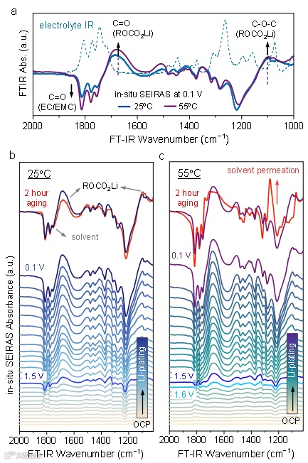 图3. 通过原位增强红外技术解释25℃与55℃下SEI的形成及动态演化。