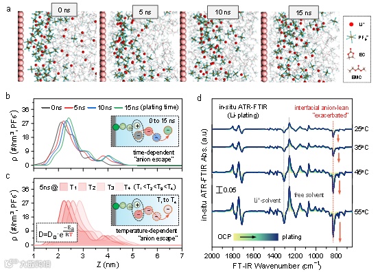 利用ATR-FTIR与SEIRAS等先进谱学技术,揭示高温下锂金属负极界面电解液构型的演化特征:锂沉积(去溶剂化)过程中,界面Li+浓度降低引发局部电荷失衡,驱动阴离子远离界面,本征形成“贫阴离子、富自由溶剂”界面;高温会加速界面处阴离子“逃逸”,进一步加剧“贫阴离子、富自由溶剂”界面劣化,这一机制经原位表征及DFT、MD理论模拟双重验证。