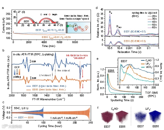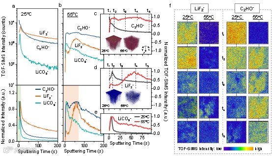 图5. 25℃与55℃下锂金属负极表面SEI的化学组分及结构分析。