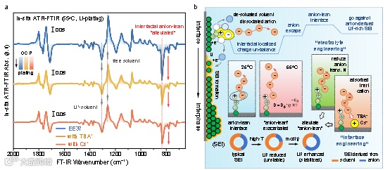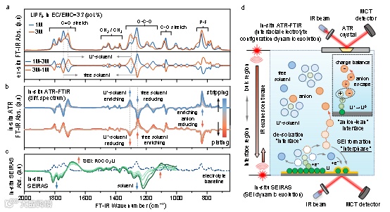 图1. 利用红外光谱技术探究锂金属负极(脱)溶过程中界面电解液构型与 SEI 的动态演化。