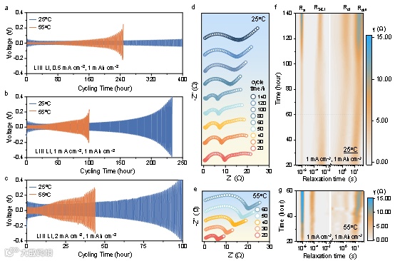 图4. 25℃与55℃下Li || Li对称电池的电化学表现对比。
