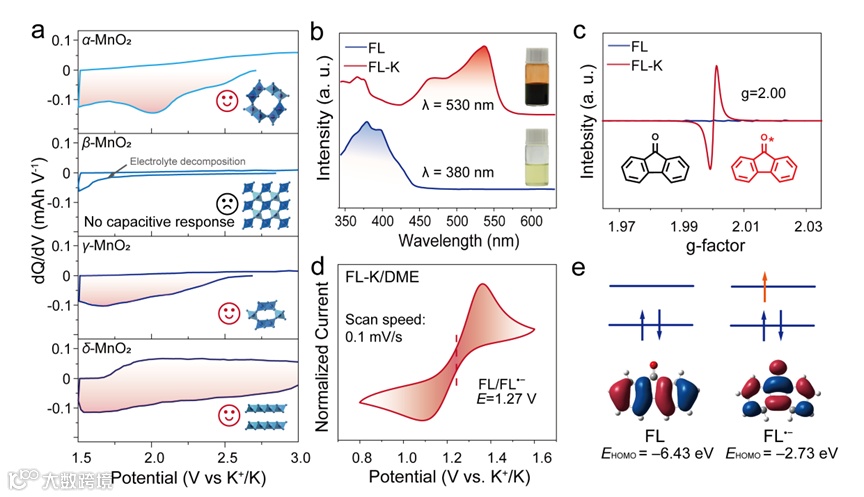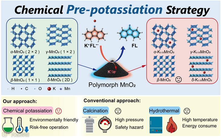 传统离子插层方法多为“自下而上”的合成,高温高压且原子利用率低。本研究开发了一种“自上而下”的温和化学预钾化方法。作者利用9-芴酮钾(FL-K)作为K+/e−供体,驱动K+自发嵌入MnO2,且其反应温和,不破坏材料主体结构。该方法仅需在常温下搅拌30秒即可完成,且试剂可循环利用,实现了近100%的原子利用率,符合绿色化学理念。