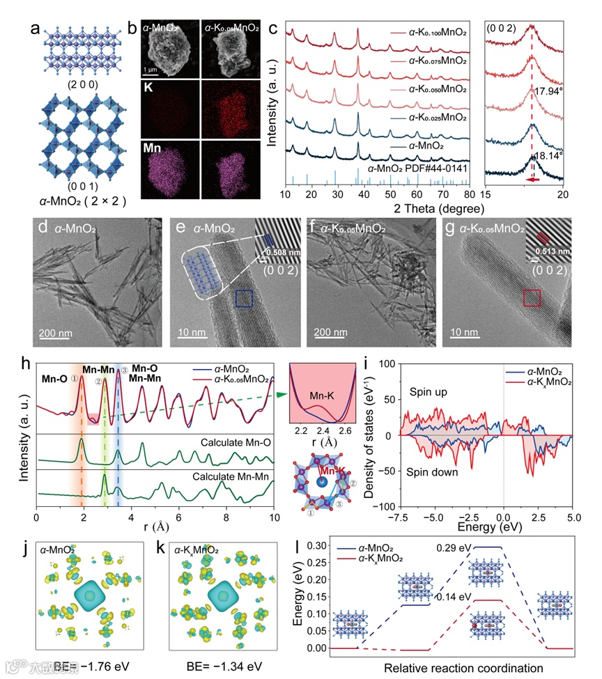 以α-MnO2为例,系统研究表明,预嵌入的K+作为结构支柱,不仅扩大了MnO2的隧道间距,还优化了电子结构。DFT计算证实,K-MnO2有更高的电子电导率,K+的引入减弱了MnO2框架对Zn2+的吸附能(从−1.76 eV降至−1.34 eV),并显著降低了Zn2+的迁移能垒(从0.29 eV降至0.14 eV),从而极大促进了离子扩散动力学和结构稳定性。