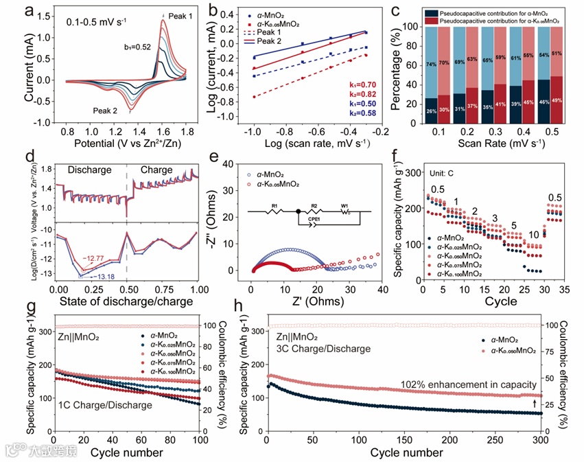 得益于结构和动力学的优化,最优化的α-K0.05MnO2正极展现出卓越的电化学性能:超高倍率性能:在10C的高倍率下仍能释放出97.5 mAh g−1的可逆容量,远超未改性α-MnO2(25.6 mAh g−1)。优异循环稳定性:在3C倍率下循环300圈后,容量保持率高达64.5%,而原始材料仅剩余38.5%。