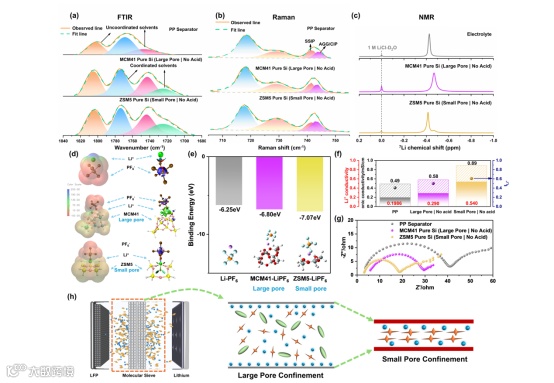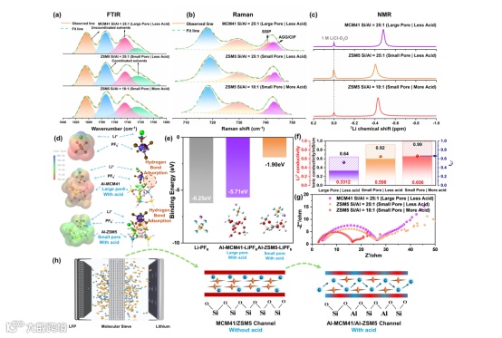 研究首先对比了无酸性的MCM-41(大孔,~2.5 nm)和ZSM-5(小孔,~0.6 nm)分子筛。光谱学分析(ATR-FTIR、Raman、⁷Li NMR)与DFT计算表明,分子筛的孔道可以选择性地“筛除”尺寸大于1 nm的溶剂分子或溶剂化团簇,同时允许Li+和PF -6通过。这种物理筛分作用在纳米尺度的孔道内实现了电解液的“浓缩”,使得更多的Li+与PF -6⁻近距离接触,从而将溶剂分离离子对转化为接触离子对和聚集体。小孔径的ZSM-5由于其更强的空间限域效应,这种调控作用更为显著,将锂离子迁移数(tLi+)从PP隔膜的0.40提升至0.61。