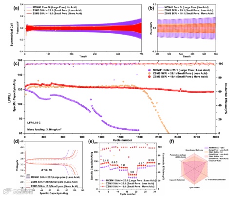 近日,来自西交利物浦大学的杨莉教授团队,在国际知名期刊 Advanced Functional Materials 上发表题为“Confined Ion Regulation via Synergy of Porosity and Acidity”的研究论文。该研究独辟蹊径,提出了一种利用分子筛的孔道限域效应与表面酸性位点协同作用,来精准调控锂离子溶剂化结构的新策略。研究人员构建了一系列基于MCM-41和ZSM-5分子筛的复合隔膜,通过系统改变其孔径(2.5 nm vs. 0.6 nm)和Bronsted/Lewis酸位点密度,深入揭示了分子筛如何“筛选”溶剂分子、“吸附”阴离子,从而将锂离子的溶剂化结构从溶剂分离离子对转变为接触离子对和聚集体。这种结构调控促进了富含LiF/Li₂O的无机SEI膜的形成,最终实现了在5C高倍率下稳定循环2900次后容量保持率高达95.7%的优异性能。